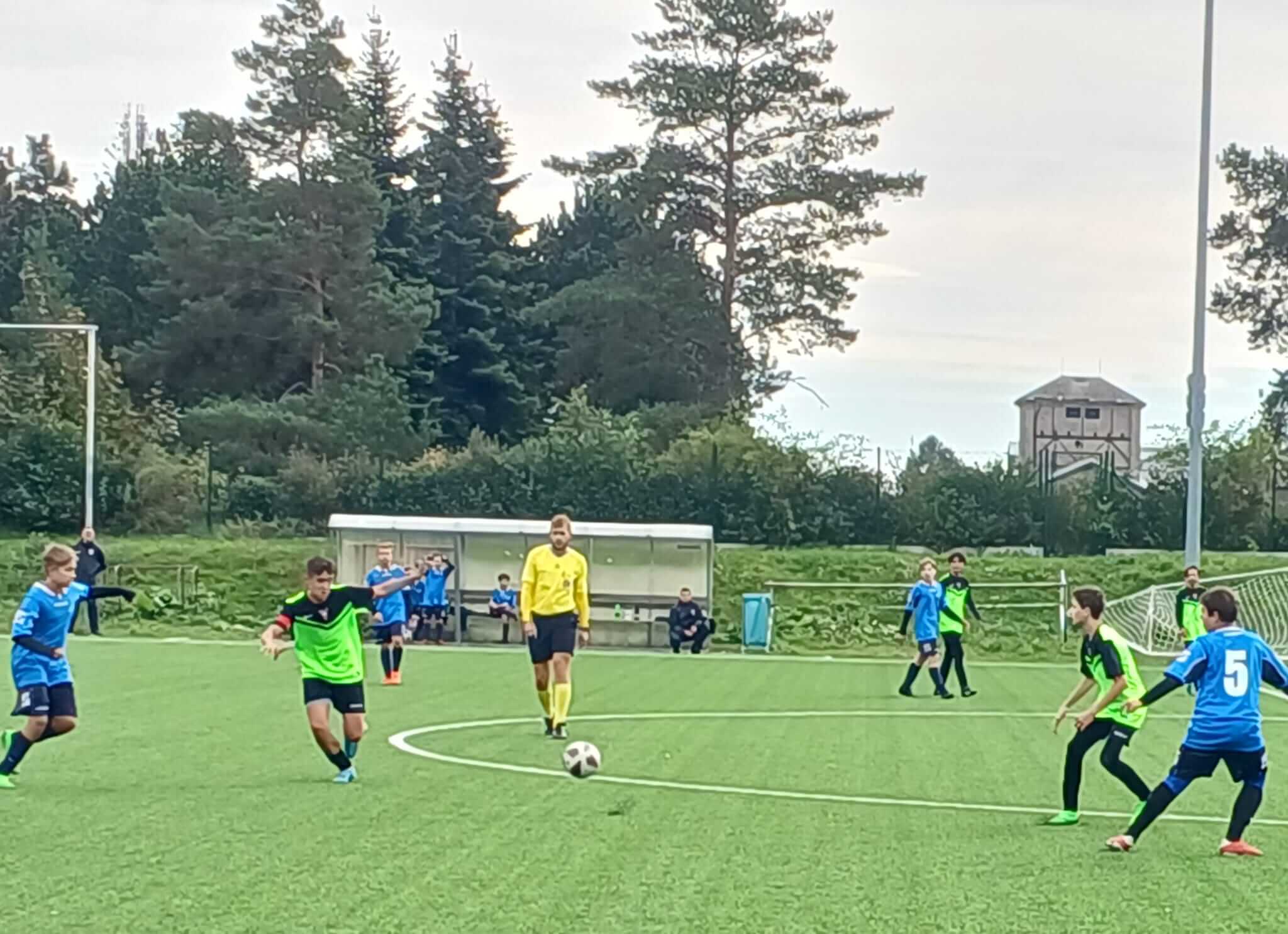 Za opravdu nezvykle hezkého počasí jsme se sešli v zoufalém počtu. Středeční déšť zlikvidoval polovinu našeho týmu a my tak měli opravdu co dělat. Do brány jsme tentokrát postavili Ondru Irimičuka z 2010. A díky za něho. Do útoku jsme tedy postavili Vlada a Lukáše na kraj zálohy. Celý náš zápas jsme postavili na hráčích v poli, musela nás posílit obrana a útok musel střílet. Věděli jsme, že pro Ondru v bráně je to úplně nová zkušenost. Na velké hřiště, velkou bránu a 11 hráčů v poli o pár let starších, nebyl zvyklý a my jsme ho chtěli podržet za každou cenu.